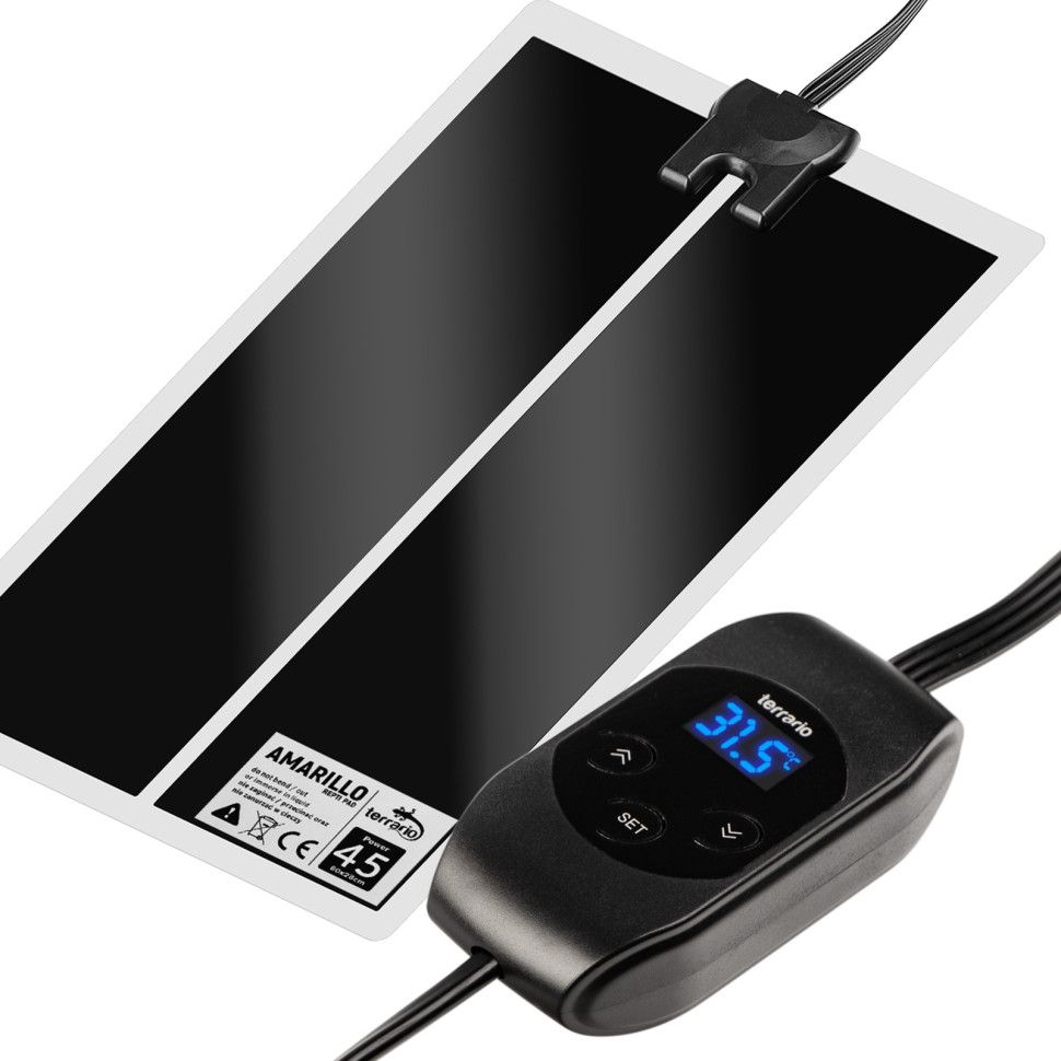 Нагрівальний килимок для тераріуму з електронним термостатом Terrario Amarillo 45W 80x28см з термостатом це простий, розумний та ефективний спосіб забезпечити оптимальні умови для обігріву вашого тераріуму. LCD контролер з терморегулятором дозволить точно запрограмувати температуру з точністю до 0,5°C. Крім того, контролер має вбудовану пам'ять. Максимальна температура нагрівального мату до 50°C.